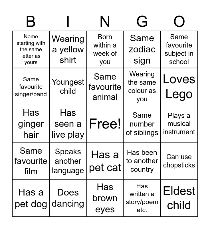 This bingo card has a free space and 24 words: Speaks another language, Does dancing, Same favourite animal, Has a pet dog, Same favourite subject in school, Name starting with the same letter as yours, Same favourite singer/band, Wearing a yellow shirt, Same number of siblings, Has a pet cat, Wearing the same colour as you, Has ginger hair, Has been to another country, Can use chopsticks, Youngest child, Has written a story/poem etc., Plays a musical instrument, Born within a week of you, Loves Lego, Has seen a live play, Eldest child, Same favourite film, Same zodiac sign and Has brown eyes.