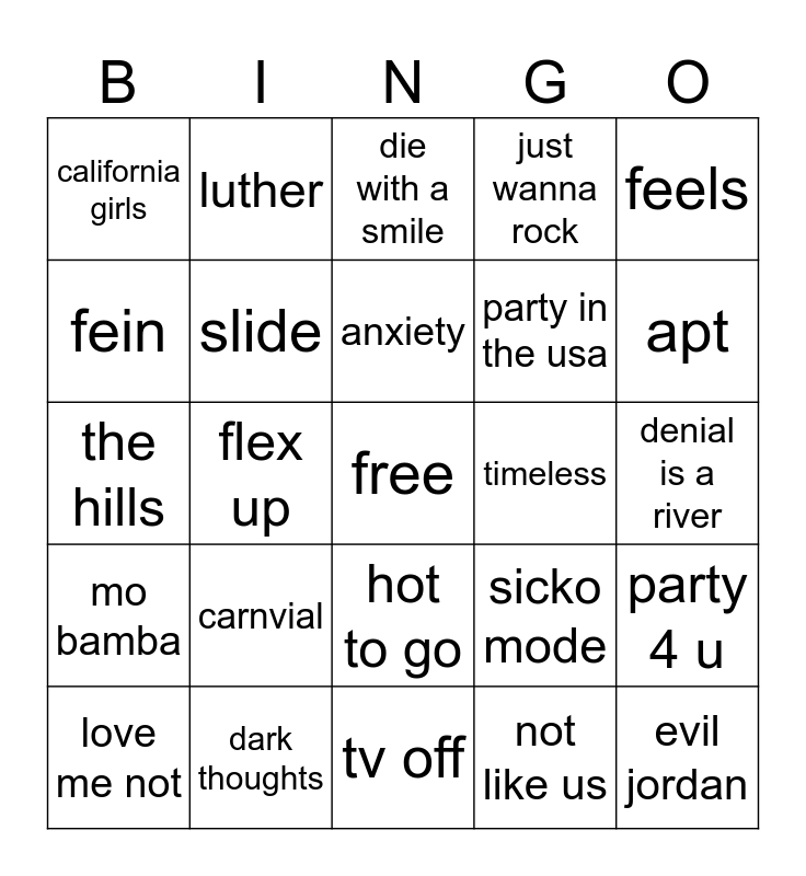 This bingo card has a free space and 24 words: carnvial, dark thoughts, anxiety, love me not, feels, california girls, fein, luther, timeless, hot to go, party in the usa, the hills, sicko mode, party 4 u, slide, not like us, denial is a river, die with a smile, apt, flex up, evil jordan, mo bamba, just wanna rock and tv off.