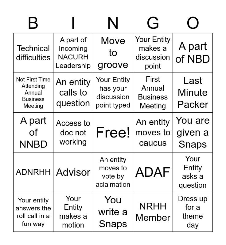 This bingo card has a free space and 30 words: Your Entity makes a motion, Your Entity makes a second, Access to doc not working, Wifi is not working, Technical difficulties, Move to groove, An entity calls to question, An entity moves to vote by aclaimation, An entity moves to caucus, You write a Snaps, You are given a Snaps, Dress up for a theme day, NRHH Member, Knows the names of all Regional Mascots, Last Minute Packer, Director, ADAF, ADNRHH, Advisor, A part of NBD, A part of NNBD, In the NACURH Leadership Slack, A part of Incoming NACURH Leadership, First Annual Business Meeting, Not First Time Attending Annual Business Meeting, Your Entity makes a discussion point, Your Entity asks a question, Your entity answers the roll call in a fun way, Your Entity has your discussion point typed and You eat a Boardroom snack.