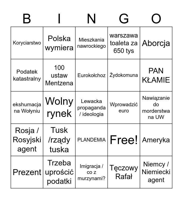 This bingo card has 25 words: Tusk /rządy tuska, Imigracja / co z murzynami?, Eurokołchoz, Prezent, Aborcja, Koryciarstwo, Podatek katastralny, Polska wymiera, Wprowadzić euro, PLANDEMIA, Żydokomuna, ekshumacja na Wołyniu, Free!, Ameryka, 100 ustaw Mentzena, Niemcy / Niemiecki agent, Nawiązanie do morderstwa na UW, Mieszkania nawrockiego, PAN KŁAMIE, Wolny rynek, Lewacka propaganda / ideologia, Trzeba uprościć podatki, Rosja / Rosyjski agent, warszawa toaleta za 650 tys and Tęczowy Rafał.
