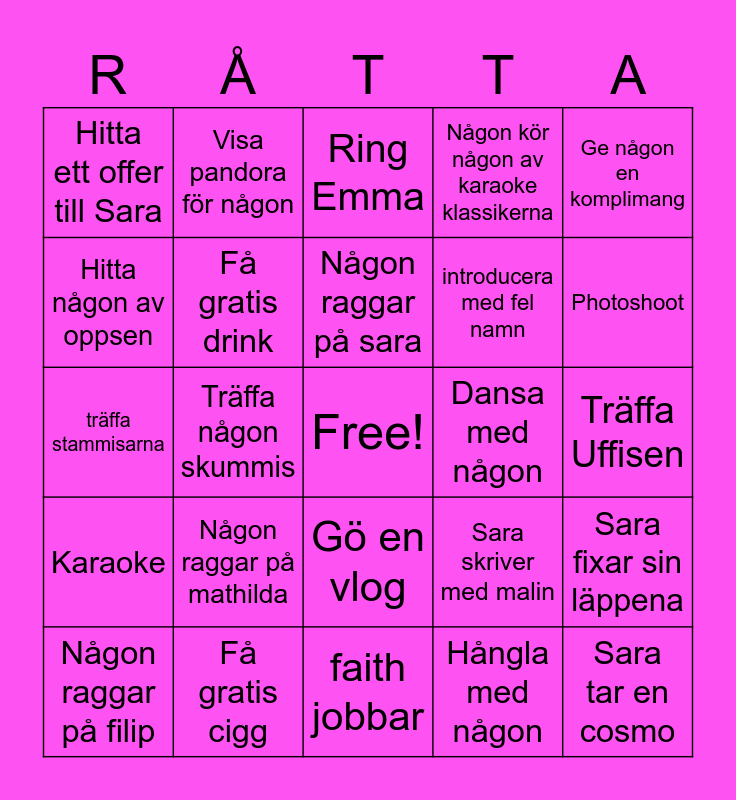 This bingo card has a free space and 24 words: Någon raggar på mathilda, Få gratis cigg, Någon raggar på sara, Någon raggar på filip, Ge någon en komplimang, Hitta ett offer till Sara, Hitta någon av oppsen, Visa pandora för någon, Dansa med någon, Gö en vlog, introducera med fel namn, träffa stammisarna, Sara skriver med malin, Sara fixar sin läppena, Få gratis drink, Hångla med någon, Träffa Uffisen, Ring Emma, Photoshoot, Träffa någon skummis, Sara tar en cosmo, Karaoke, Någon kör någon av karaoke klassikerna and faith jobbar.