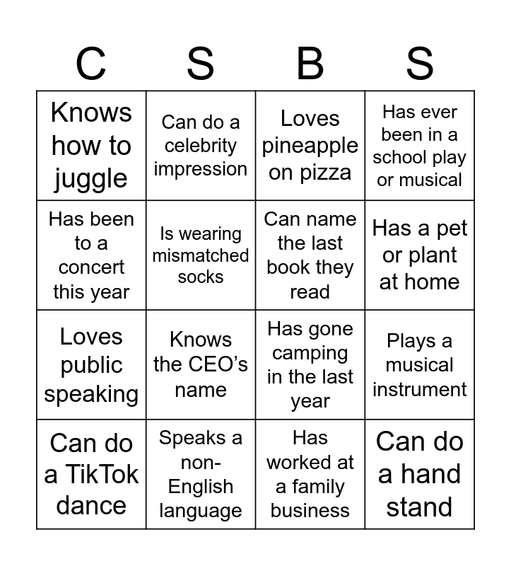 This bingo card has 16 words: Speaks a non-English language, Plays a musical instrument, Loves pineapple on pizza, Knows how to juggle, Loves public speaking, Can do a celebrity impression, Has gone camping in the last year, Has worked at a family business, Has been to a concert this year, Is wearing mismatched socks, Can do a TikTok dance, Has ever been in a school play or musical, Knows the CEO’s name, Has a pet or plant at home, Can name the last book they read and Can do a hand stand.