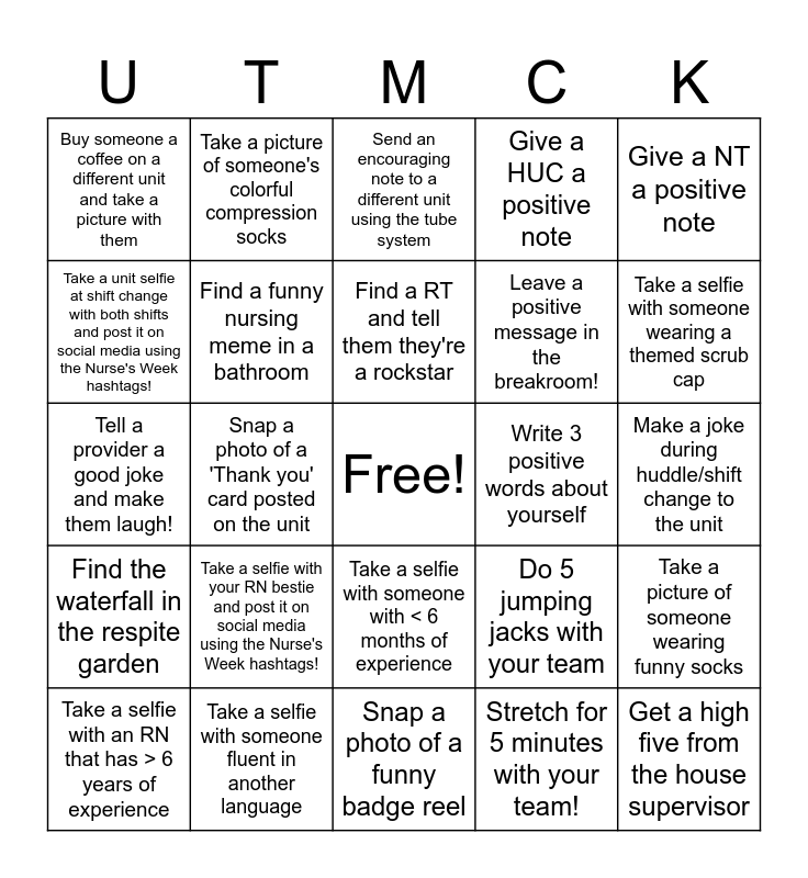 This bingo card has a free space and 24 words: Take a selfie with your RN bestie and post it on social media using the Nurse's Week hashtags!, Take a selfie with someone fluent in another language, Find a RT and tell them they're a rockstar, Take a selfie with an RN that has > 6 years of experience, Give a NT a positive note, Buy someone a coffee on a different unit and take a picture with them, Take a unit selfie at shift change with both shifts and post it on social media using the Nurse's Week hashtags!, Take a picture of someone's colorful compression socks, Write 3 positive words about yourself, Take a selfie with someone with < 6 months of experience, Leave a positive message in the breakroom!, Tell a provider a good joke and make them laugh!, Do 5 jumping jacks with your team, Take a picture of someone wearing funny socks, Find a funny nursing meme in a bathroom, Stretch for 5 minutes with your team!, Make a joke during huddle/shift change to the unit, Send an encouraging note to a different unit using the tube system, Take a selfie with someone wearing a themed scrub cap, Snap a photo of a 'Thank you' card posted on the unit, Get a high five from the house supervisor, Find the waterfall in the respite garden, Give a HUC a positive note and Snap a photo of a funny badge reel.