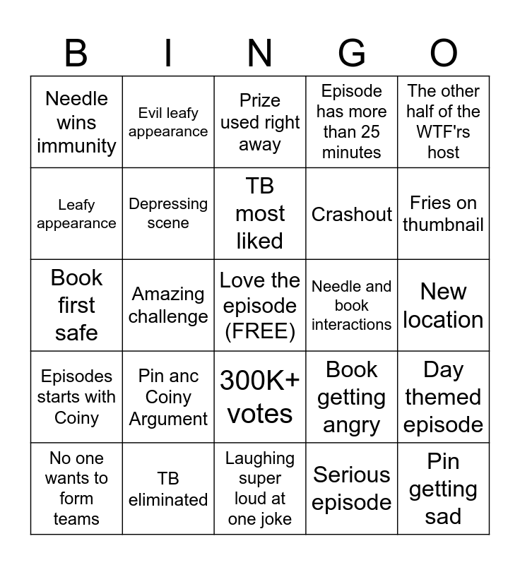 This bingo card has a free space and 24 words: Pin anc Coiny Argument, TB eliminated, TB most liked, No one wants to form teams, The other half of the WTF'rs host, Needle wins immunity, Leafy appearance, Evil leafy appearance, Needle and book interactions, 300K+ votes, Crashout, Book first safe, Book getting angry, Day themed episode, Depressing scene, Serious episode, New location, Prize used right away, Fries on thumbnail, Amazing challenge, Pin getting sad, Episodes starts with Coiny, Episode has more than 25 minutes and Laughing super loud at one joke.