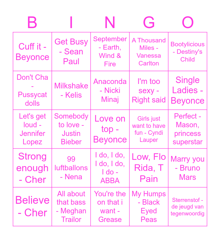 This bingo card has a free space and 24 words: 99 luftballons - Nena, All about that bass - Meghan Trailor, Anaconda - Nicki Minaj, Believe - Cher, Bootylicious - Destiny's Child, Cuff it - Beyonce, Don't Cha - Pussycat dolls, Get Busy - Sean Paul, Girls just want to have fun - Cyndi Lauper, I do, I do, I do, I do, I do - ABBA, I'm too sexy - Right said, Let's get loud - Jennifer Lopez, Low, Flo Rida, T Pain, Marry you - Bruno Mars, Milkshake - Kelis, My Humps - Black Eyed Peas, Perfect - Mason, princess superstar, September - Earth, Wind & Fire, Single Ladies - Beyonce, Somebody to love - Justin Bieber, Sterrenstof - de jeugd van tegenwoordig, Strong enough - Cher, A Thousand Miles - Vanessa Carlton and You're the on that i want - Grease.