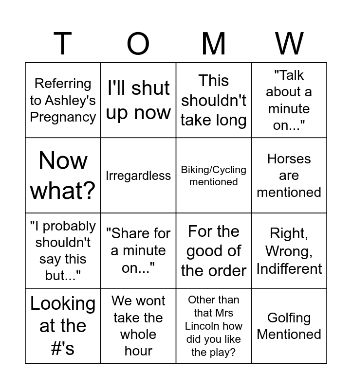 This bingo card has 16 words: We wont take the whole hour, Right, Wrong, Indifferent, This shouldn't take long, Referring to Ashley's Pregnancy, "I probably shouldn't say this but...", I'll shut up now, For the good of the order, Other than that Mrs Lincoln how did you like the play?, Now what?, Irregardless, Looking at the #'s, "Talk about a minute on...", "Share for a minute on...", Horses are mentioned, Biking/Cycling mentioned and Golfing Mentioned.