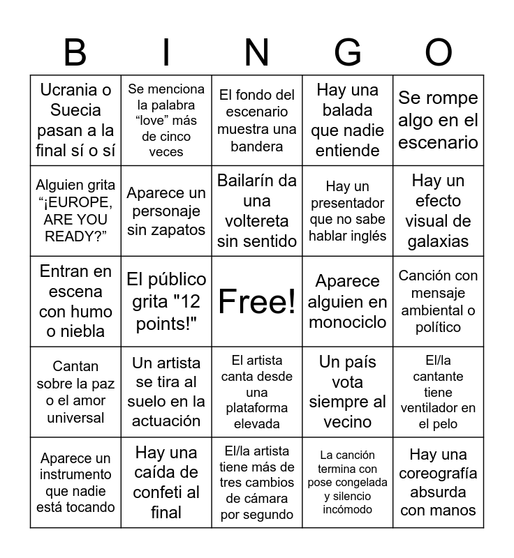 This bingo card has a free space and 36 words: Cantan en un idioma inventado, Hay un fuego artificial innecesario, Vestuario brilla más que el talento, Aparece un personaje sin zapatos, Un país vota siempre al vecino, Cantan sobre la paz o el amor universal, Bailarín da una voltereta sin sentido, Presentador hace un chiste incómodo, Se rompe algo en el escenario, El artista llora o se emociona, El público grita "12 points!", Hay una balada que nadie entiende, El Reino Unido queda último, Aparece alguien en monociclo, Hay un efecto visual de galaxias, Ucrania o Suecia pasan a la final sí o sí, Alguien canta con una capa dramática, Un artista se tira al suelo en la actuación, Hay una coreografía absurda con manos, El fondo del escenario muestra una bandera, Canción con mensaje ambiental o político, El/la cantante tiene ventilador en el pelo, Hay una caída de confeti al final, Aparece un instrumento que nadie está tocando, El/la artista tiene más de tres cambios de cámara por segundo, Se menciona la palabra “love” más de cinco veces, Entran en escena con humo o niebla, Un país recibe 12 puntos y nadie aplaude, Hay un presentador que no sabe hablar inglés, Alguien grita “¡EUROPE, ARE YOU READY?”, Una canción suena sospechosamente como otra famosa, El televoto cambia completamente el resultad, La canción termina con pose congelada y silencio incómodo, El artista canta desde una plataforma elevada, Hay contacto visual intenso con la cámara durante 10 segundos and Hay fuego durante la actuación.