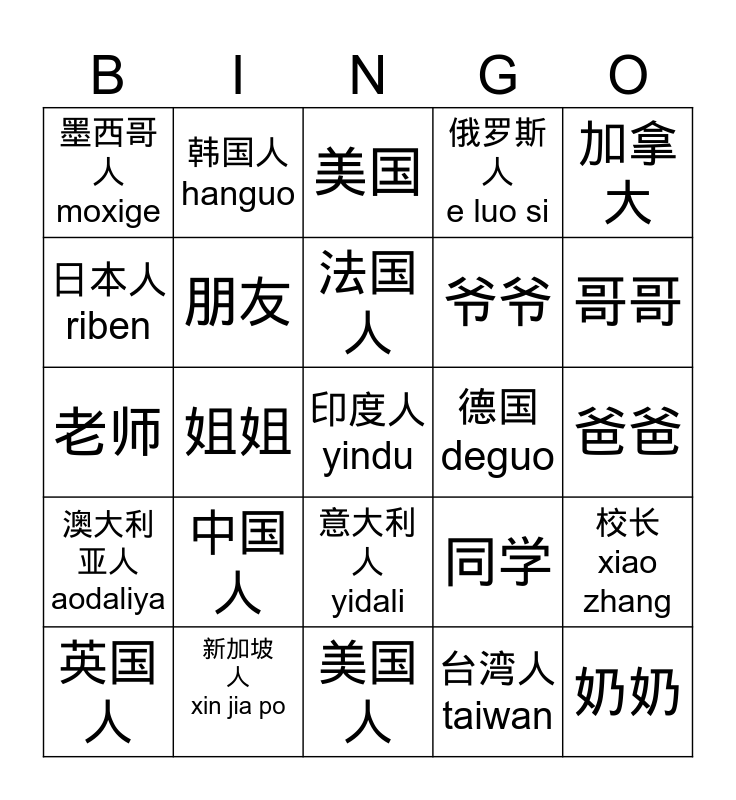 This bingo card has 25 words: 中国人, 美国人, 法国人, 英国人, 加拿大, 墨西哥 人 moxige, 日本人 riben, 韩国人 hanguo, 德国 deguo, 意大利 人 yidali, 爷爷, 老师, 同学, 校长 xiao zhang, 朋友, 奶奶, 爸爸, 美国, 哥哥, 姐姐, 印度人 yindu, 新加坡人 xin jia po, 澳大利亚人 aodaliya, 俄罗斯人 e luo si and 台湾人 taiwan.