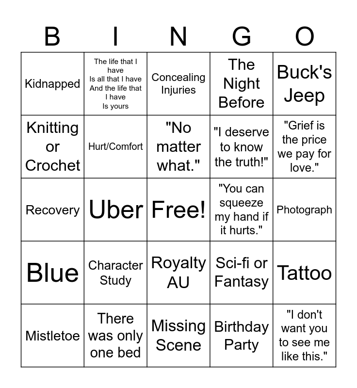 This bingo card has a free space and 24 words: Character Study, There was only one bed, "No matter what.", Mistletoe, Buck's Jeep, Kidnapped, Knitting or Crochet, The life that I have Is all that I have And the life that I have Is yours, "You can squeeze my hand if it hurts.", Royalty AU, "I deserve to know the truth!", Recovery, Sci-fi or Fantasy, Tattoo, Hurt/Comfort, Birthday Party, Photograph, Concealing Injuries, "Grief is the price we pay for love.", Uber, "I don't want you to see me like this.", Blue, The Night Before and Missing Scene.