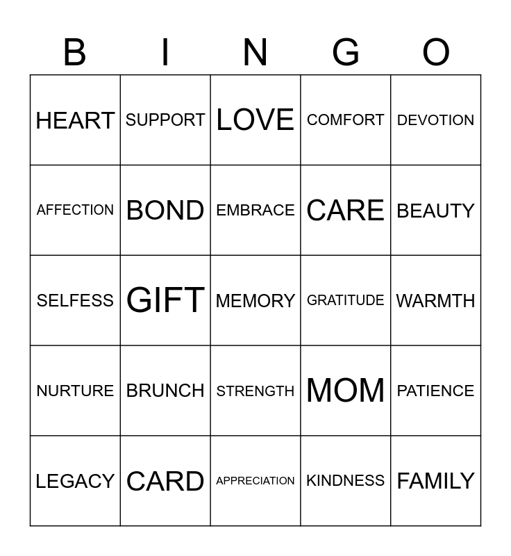 This bingo card has 30 words: CARD, MOTHERHOOD, GIFT, CELEBRATION, HEART, LOVE, BOND, STRENGTH, GRATITUDE, APPRECIATION, WARMTH, MEMORY, KINDNESS, FAMILY, BEAUTY, HUGS, MOM, NURTURE, BRUNCH, DEVOTION, SELFESS, FLOWERS, SUPPORT, CARE, AFFECTION, COMFORT, PATIENCE, LEGACY, EMBRACE and HOME.