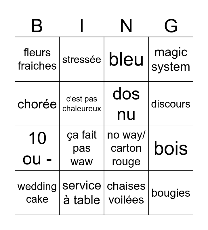 This bingo card has 16 words: service à table, bois, bleu, fleurs fraiches, 10 ou -, stressée, no way/ carton rouge, chaises voilées, chorée, c'est pas chaleureux, wedding cake, magic system, ça fait pas waw, discours, dos nu and bougies.