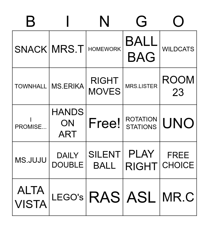 This bingo card has a free space and 24 words: DAILY DOUBLE, LEGO's, RIGHT MOVES, ALTA VISTA, WILDCATS, SNACK, TOWNHALL, MRS.T, ROTATION STATIONS, SILENT BALL, MRS.LISTER, I PROMISE..., PLAY RIGHT, FREE CHOICE, MS.ERIKA, ASL, UNO, HOMEWORK, ROOM 23, HANDS ON ART, MR.C, MS.JUJU, BALL BAG and RAS.