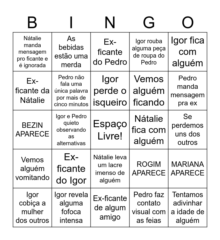 This bingo card has a free space and 24 words: Ex-ficante do Igor, Igor revela alguma fofoca intensa, Igor perde o isqueiro, Igor cobiça a mulher dos outros, Igor fica com alguém, Nátalie manda mensagem pro ficante e é ignorada, Ex-ficante da Nátalie, As bebidas estão uma merda, Nátalie fica com alguém, Nátalie leva um lacre imenso de alguém, Vemos alguém ficando, BEZIN APARECE, ROGIM APARECE, MARIANA APARECE, Pedro não fala uma única palavra por mais de cinco minutos, Pedro faz contato visual com as feias, Se perdemos uns dos outros, Ex-ficante do Pedro, Pedro manda mensagem pra ex, Igor e Pedro quieto observando as alternativas, Tentamos adivinhar a idade de alguém, Vemos alguém vomitando, Igor rouba alguma peça de roupa do Pedro and Ex-ficante de algum amigo.