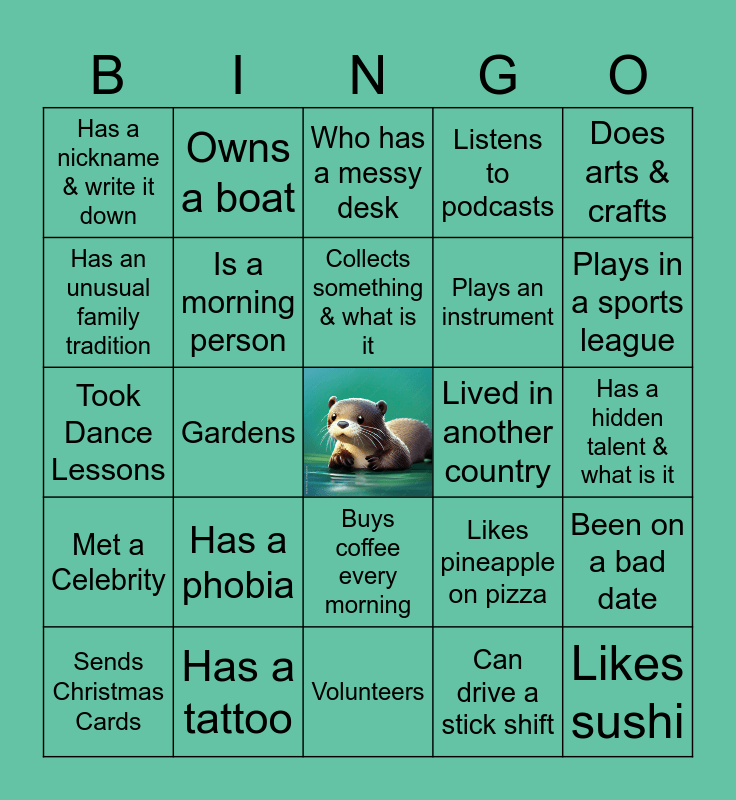 This bingo card has a free space and 24 words: Sends Christmas Cards, Has a phobia, Collects something & what is it, Can drive a stick shift, Does arts & crafts, Has a nickname & write it down, Owns a boat, Who has a messy desk, Lived in another country, Has a hidden talent & what is it, Took Dance Lessons, Is a morning person, Likes pineapple on pizza, Been on a bad date, Has an unusual family tradition, Has a tattoo, Volunteers, Listens to podcasts, Plays in a sports league, Met a Celebrity, Gardens, Buys coffee every morning, Plays an instrument and Likes sushi.