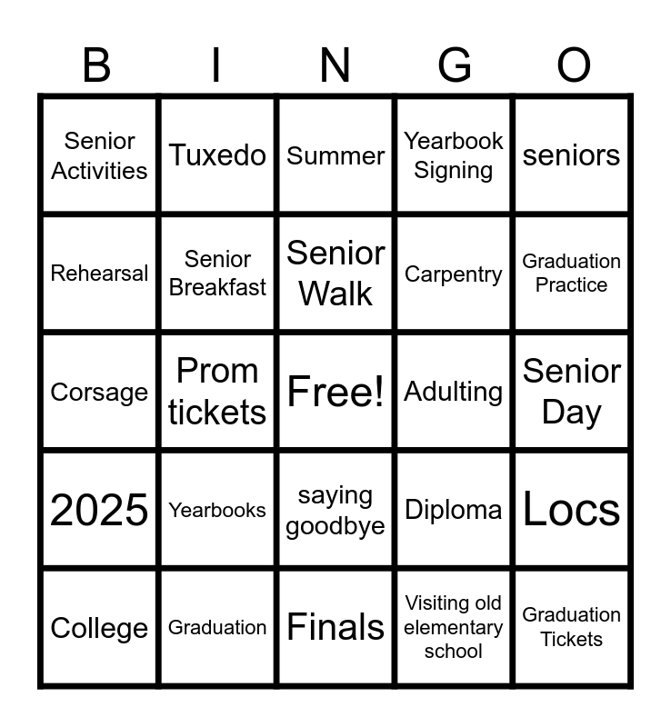 This bingo card has a free space and 27 words: Diploma, Prom, Carpentry, Finals, Rehearsal, Summer, Tuxedo, 2025, Adulting, Locs, Corsage, Yearbook Signing, College, Graduation, Graduation Practice, Senior Picnic, Senior Breakfast, Senior Walk, Yearbooks, Senior Activities, Senior Day, Visiting old elementary school, Prom tickets, Graduation Tickets, saying goodbye, seniors and practice.