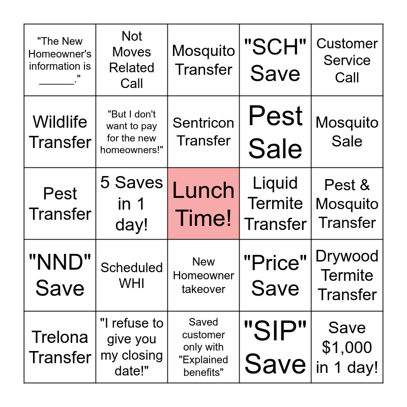 This bingo card has a free space and 24 words: Scheduled WHI, "I refuse to give you my closing date!", Sentricon Transfer, Trelona Transfer, Customer Service Call, "The New Homeowner's information is ______.", Wildlife Transfer, Not Moves Related Call, Liquid Termite Transfer, New Homeowner takeover, Pest Sale, Pest Transfer, "Price" Save, Drywood Termite Transfer, "But I don't want to pay for the new homeowners!", "SIP" Save, Pest & Mosquito Transfer, Mosquito Transfer, Mosquito Sale, 5 Saves in 1 day!, Save $1,000 in 1 day!, "NND" Save, "SCH" Save and Saved customer only with "Explained benefits".