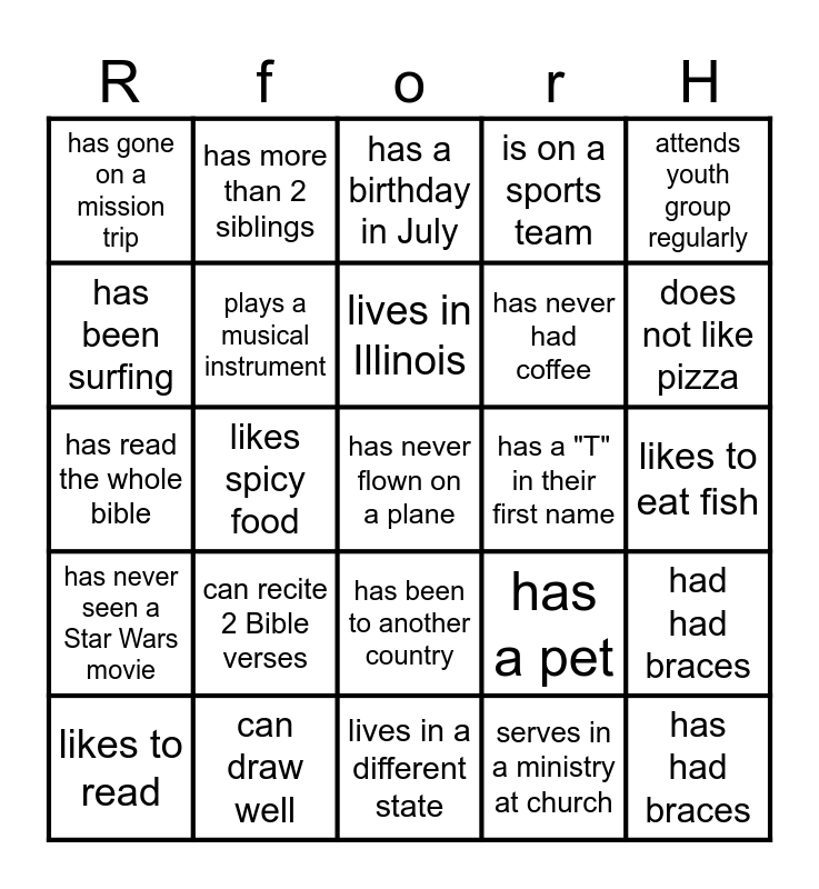 This bingo card has a free space and 24 words: likes to read, can recite 2 Bible verses, lives in Illinois, serves in a ministry at church, attends youth group regularly, has gone on a mission trip, has more than 2 siblings, has a birthday in July, has a "T" in their first name, likes to eat fish, has read the whole bible, plays a musical instrument, has a pet, had had braces, has been surfing, can draw well, lives in a different state, is on a sports team, does not like pizza, has never seen a Star Wars movie, likes spicy food, has been to another country, has never had coffee and has had braces.