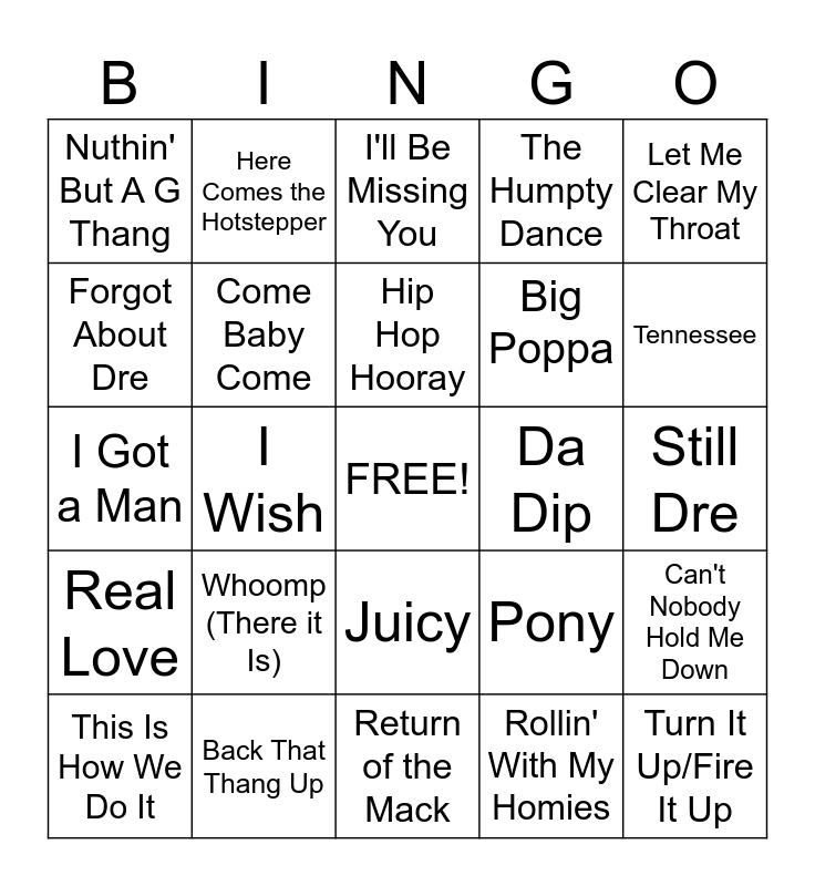 This bingo card has a free space and 59 words: Ain't Gonna Hurt Nobody, Back That Thang Up, Been Around The World, California Love, Can't Nobody Hold Me Down, C'mon N' Ride It, Come Baby Come, Creep, Da Dip, Shoop, Forgot About Dre, Gangsta's Paradise, Big Poppa, Gin & Juice, Feels So Good, Here Comes the Hotstepper, Hip Hop Hooray, The Humpty Dance, I Got 5 on It, I Got a Man, I Wish, I'll Be Missing You, Informer, Still Dre, It Wasn't Me, Its' All About/Benjamins, Juicy, Jump Around, Let Me Clear My Throat, Loungin, Mo Money Mo Problems, My Name Is, No Diggity, Now That We Found Love, Nuthin' But A G Thang, O.P.P., Poison, Pony, Pop Goes The Weasel, Real Love, Regulate, Return of the Mack, Rollin' With My Homies, Rump Shaker, Sabotage, Same Song, Set Adrift/Memory Bliss, Shoop, Tennessee, This Is How We Do It, Too Close, Too Legit to Quit, Tootsie Roll, Turn It Up/Fire It Up, What It's Like, Whoomp (There it Is), You Can Do It, You're All I Need and 1,2,3,4 (Sumpin' New).