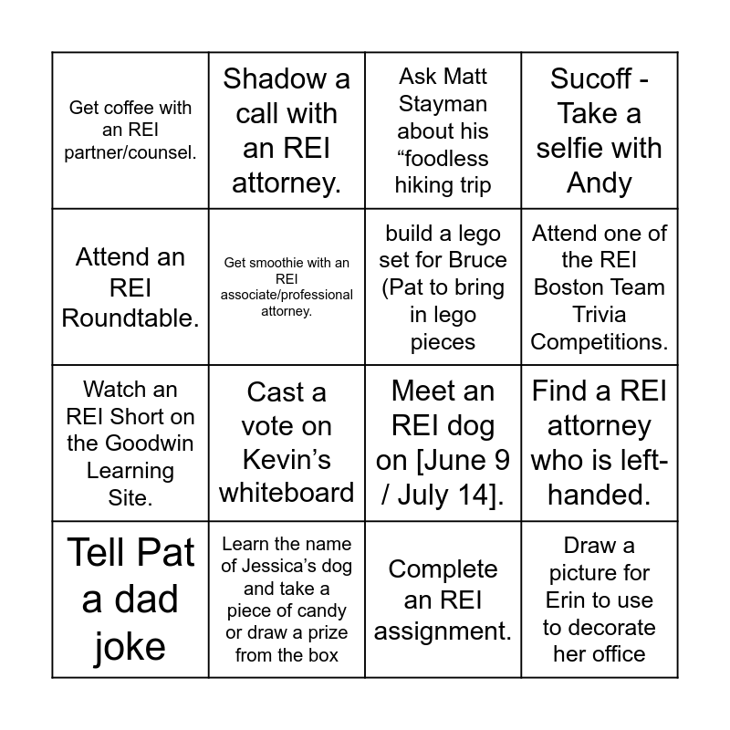 This bingo card has 26 words: Attend the REI Summer Social at [place]., Attend an REI LPA meeting., Attend one of the REI Boston Team Trivia Competitions., Attend an “REI Boston Lunch Bunch” lunch., Attend an REI Roundtable., Get coffee with an REI partner/counsel., Get smoothie with an REI associate/professional attorney., Shadow a call with an REI attorney., Complete an REI assignment., Participate in the REI PSA program., Watch an REI Short on the Goodwin Learning Site., Meet an REI dog on [June 9 / July 14]., Meet with an REI attorney who is a fellow law school alum., Find an REI attorney who has worked here 5+ years., Find a REI attorney who is left-handed., Haggerty - Teach John a new slang term., Sucoff - Take a selfie with Andy, Draw a picture for Erin to use to decorate her office, Ask Matt Stayman about his “foodless hiking trip, Tell Pat a dad joke, Cast a vote on Kevin’s whiteboard, make Marisa an origami flower, Learn the name of Jessica’s dog and take a piece of candy or draw a prize from the box, Ask Ryan Sawyer about his pro bono victory for GLAD’s Name Change Project, build a lego set for Bruce (Pat to bring in lego pieces and Tisdale - find a duck and return it to Tisdale.