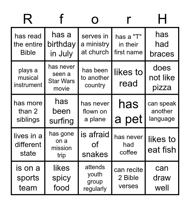 This bingo card has a free space and 24 words: has gone on a mission trip, likes spicy food, has been to another country, is on a sports team, has had braces, has read the entire Bible, plays a musical instrument, has a birthday in July, has a pet, is afraid of snakes, likes to read, has more than 2 siblings, has never had coffee, likes to eat fish, has never seen a Star Wars movie, can recite 2 Bible verses, can speak another language, serves in a ministry at church, does not like pizza, has been surfing, can draw well, lives in a different state, has a "T" in their first name and attends youth group regularly.