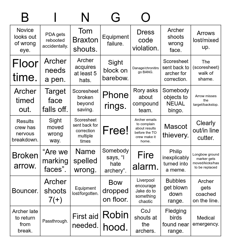 This bingo card has a free space and 57 words: Death of a spider., Arrow misses the target/backstop., Bow upside down., Novice looks out of wrong eye., Sight moved wrong way., Bow dropped on floor., Arrows lost/mixed up., Inappropriate cheering., Archer needs a pen., Liverpool encourage Jake do to something chaotic, Equipment failure., Bouncer., Broken arrow., Clearly out/in line cutter., First aid needed., “Are we marking faces”., Dress code violation., Danage/chronitirs go BANG., IANSEO stops working., Scoresheet sent back to archer for correction., The (scoresheet) walk of shame., Name spelled wrong., Rory asks about compound team., Tom Braxton shouts., Glitter/ sticker bomb., Floor time., Mascot thievery., Blåhajs convention., Archer acquires at least 5 hats., Somebody says, “I hate archery”., Someone trips over a taped down wire, Longbow ground marker gets moved/kicks/has to be replaced, Passthrough., Robin hood., Archer timed out., Archer shoots wrong face., Archer shoots 7(+), Sight block on barebow., Equipment lost/forgotten., Target face falls off., PDA gets rebooted accidentally., Phone rings., Medical emergency., Darwin award nominee., Archer gets coached on the line., Archer late to return from break., Scoresheet broken beyond saving., Results crew has nervous breakdown., CoJ shouts at the archers., Philip inexplicably turned into a meme., Archer emails to complain about results before the TO crew make it home., Scoresheet sent back for correction multiple times, Fire alarm., Bubbles get blown down range., Fledging birds found near range., Somebody objects to NEUAL bingo. and 2 bosses stacked together.