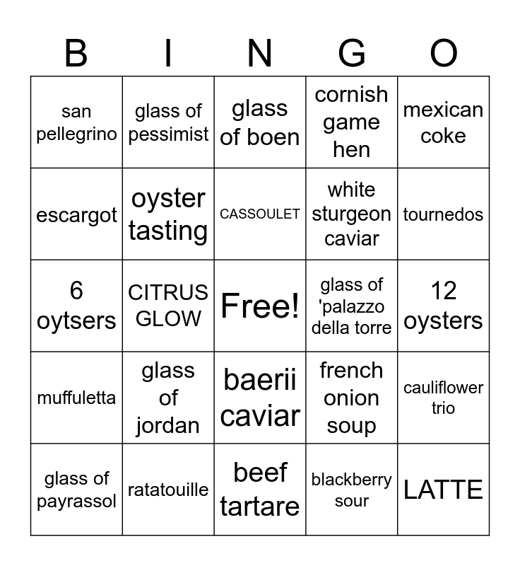 This bingo card has a free space and 24 words: glass of payrassol, glass of jordan, CASSOULET, blackberry sour, mexican coke, san pellegrino, glass of pessimist, glass of boen, glass of 'palazzo della torre, 12 oysters, 6 oytsers, oyster tasting, french onion soup, cauliflower trio, escargot, ratatouille, beef tartare, cornish game hen, tournedos, muffuletta, CITRUS GLOW, baerii caviar, white sturgeon caviar and LATTE.