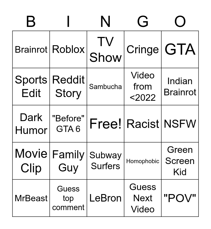 This bingo card has a free space and 24 words: Family Guy, Guess top comment, Sambucha, MrBeast, GTA, Brainrot, Sports Edit, Roblox, Racist, Subway Surfers, Video from <2022, Dark Humor, Homophobic, Green Screen Kid, Reddit Story, Guess Next Video, NSFW, TV Show, Indian Brainrot, "Before" GTA 6, "POV", Movie Clip, Cringe and LeBron.