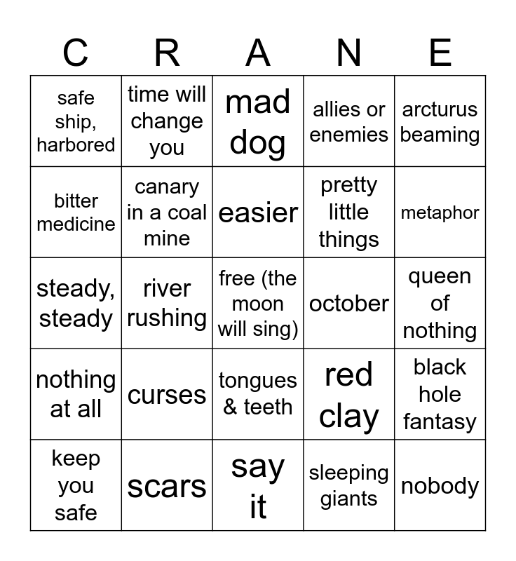 This bingo card has a free space and 24 words: curses, scars, easier, keep you safe, arcturus beaming, safe ship, harbored, bitter medicine, time will change you, october, tongues & teeth, pretty little things, steady, steady, red clay, black hole fantasy, canary in a coal mine, sleeping giants, queen of nothing, mad dog, metaphor, river rushing, nobody, nothing at all, allies or enemies and say it.