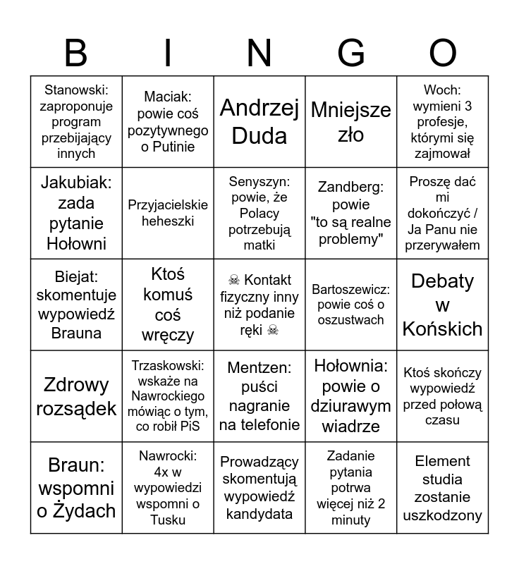 This bingo card has a free space and 24 words: Trzaskowski: wskaże na Nawrockiego mówiąc o tym, co robił PiS, Nawrocki: 4x w wypowiedzi wspomni o Tusku, Senyszyn: powie, że Polacy potrzebują matki, Braun: wspomni o Żydach, Woch: wymieni 3 profesje, którymi się zajmował, Stanowski: zaproponuje program przebijający innych, Jakubiak: zada pytanie Hołowni, Maciak: powie coś pozytywnego o Putinie, Bartoszewicz: powie coś o oszustwach, Mentzen: puści nagranie na telefonie, Zandberg: powie "to są realne problemy", Biejat: skomentuje wypowiedź Brauna, Hołownia: powie o dziurawym wiadrze, Ktoś skończy wypowiedź przed połową czasu, Przyjacielskie heheszki, Zadanie pytania potrwa więcej niż 2 minuty, Debaty w Końskich, Andrzej Duda, Proszę dać mi dokończyć / Ja Panu nie przerywałem, Ktoś komuś coś wręczy, Element studia zostanie uszkodzony, Zdrowy rozsądek, Mniejsze zło and Prowadzący skomentują wypowiedź kandydata.