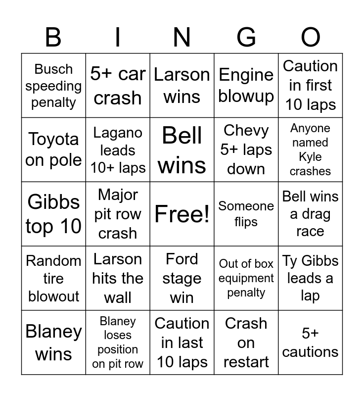 This bingo card has a free space and 24 words: Larson hits the wall, Blaney loses position on pit row, Bell wins, Blaney wins, Caution in first 10 laps, Busch speeding penalty, Toyota on pole, 5+ car crash, Someone flips, Ford stage win, Chevy 5+ laps down, Gibbs top 10, Out of box equipment penalty, Ty Gibbs leads a lap, Lagano leads 10+ laps, Crash on restart, Bell wins a drag race, Larson wins, Anyone named Kyle crashes, Major pit row crash, 5+ cautions, Random tire blowout, Engine blowup and Caution in last 10 laps.