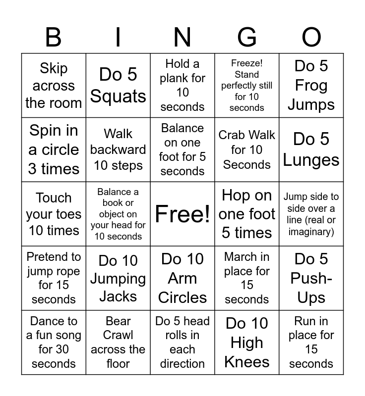 This bingo card has a free space and 24 words: Do 10 Jumping Jacks, Bear Crawl across the floor, Balance on one foot for 5 seconds, Dance to a fun song for 30 seconds, Do 5 Frog Jumps, Skip across the room, Spin in a circle 3 times, Do 5 Squats, Hop on one foot 5 times, Do 10 Arm Circles, Crab Walk for 10 Seconds, Touch your toes 10 times, March in place for 15 seconds, Do 5 Push-Ups, Walk backward 10 steps, Do 10 High Knees, Jump side to side over a line (real or imaginary), Hold a plank for 10 seconds, Do 5 Lunges, Balance a book or object on your head for 10 seconds, Run in place for 15 seconds, Pretend to jump rope for 15 seconds, Freeze! Stand perfectly still for 10 seconds and Do 5 head rolls in each direction.
