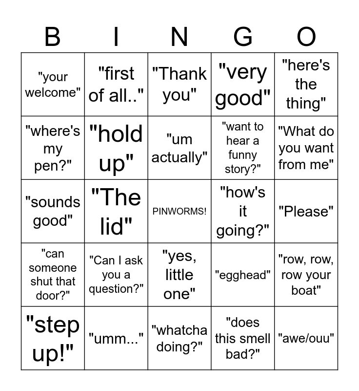 This bingo card has a free space and 24 words: "Can I ask you a question?", "umm...", "um actually", "step up!", "here's the thing", "your welcome", "where's my pen?", "first of all..", "how's it going?", "yes, little one", "want to hear a funny story?", "sounds good", "egghead", "row, row, row your boat", "hold up", "does this smell bad?", "Please", "Thank you", "What do you want from me", "The lid", "awe/ouu", "can someone shut that door?", "very good" and "whatcha doing?".