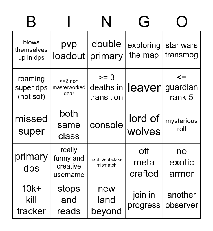 This bingo card has a free space and 24 words: really funny and creative username, stops and reads, >= 3 deaths in transition, 10k+ kill tracker, star wars transmog, blows themselves up in dps, roaming super dps (not sof), pvp loadout, lord of wolves, exotic/subclass mismatch, leaver, missed super, off meta crafted, no exotic armor, >=2 non masterworked gear, join in progress, mysterious roll, double primary, <= guardian rank 5, both same class, another observer, primary dps, exploring the map and new land beyond.