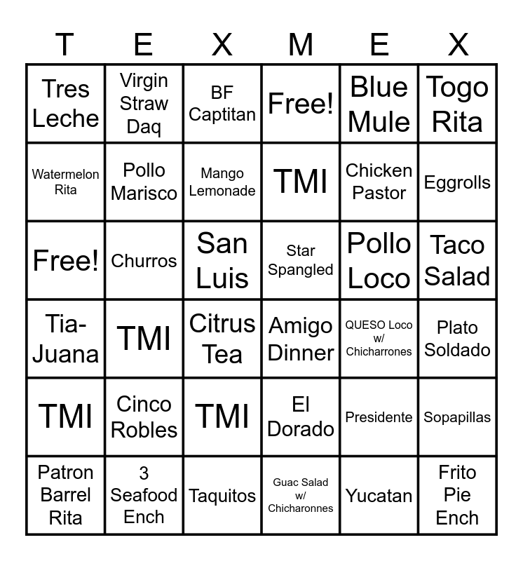This bingo card has 36 words: El Dorado, TMI, Guac Salad w/ Chicharonnes, Watermelon Rita, Tia-Juana, Star Spangled, Pollo Marisco, Taquitos, Blue Mule, Presidente, Eggrolls, Free!, Sopapillas, Churros, TMI, Tres Leche, TMI, Pollo Loco, Free!, BF Captitan, San Luis, TMI, Amigo Dinner, Citrus Tea, QUESO Loco w/ Chicharrones, Virgin Straw Daq, Chicken Pastor, 3 Seafood Ench, Mango Lemonade, Togo Rita, Frito Pie Ench, Patron Barrel Rita, Plato Soldado, Taco Salad, Cinco Robles and Yucatan.