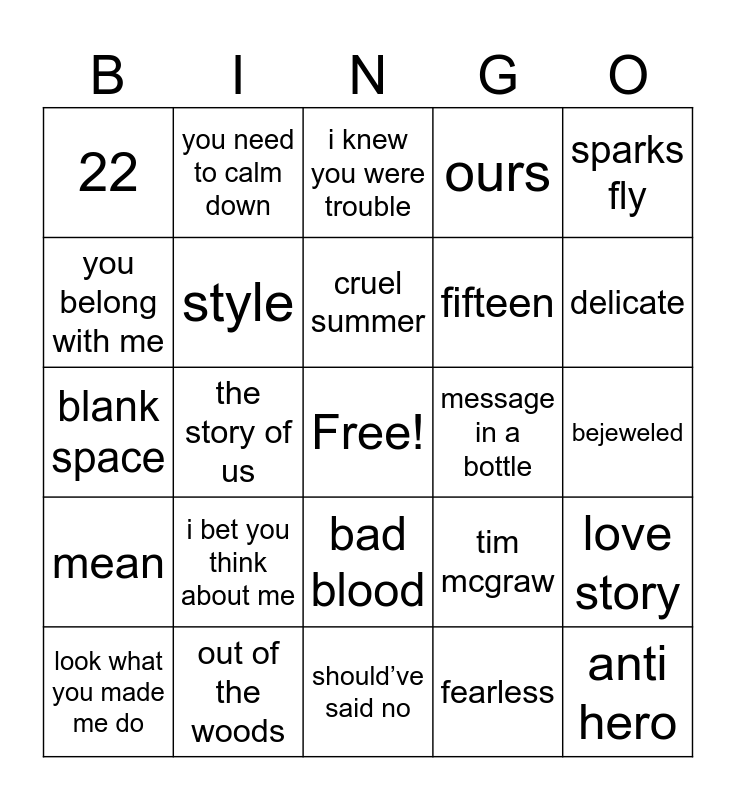 This bingo card has a free space and 40 words: i can do it with a broken heart, blank space, fortnight, style, out of the woods, bad blood, cruel summer, mine, sparks fly, mean, the story of us, ours, anti hero, bejeweled, message in a bottle, i bet you think about me, red, 22, we are never ever getting back together, i knew you were trouble, love story, fearless, fifteen, you belong with me, the man, lover, me!, … ready for it?, shake it off, wildest dreams, picture to burn, look what you made me do, our song, tim mcgraw, delicate, should’ve said no, new romantics, getaway car, you need to calm down and karma.