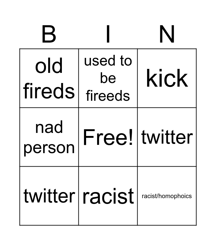 This bingo card has a free space and 14 words: leakde dms, twitch, twitter, used to be fireeds, nad person, racist/homophoics, stolen mdole, pedo, racist, old fireds, leaked dms, twitter, kick and bad person.