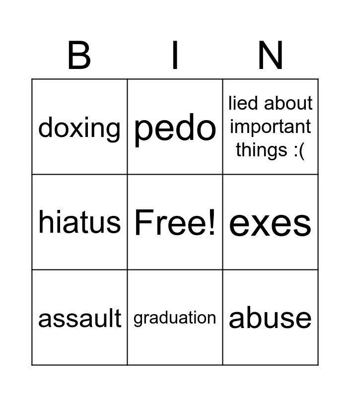 This bingo card has a free space and 8 words: exes, lied about important things :(, pedo, assault, doxing, abuse, hiatus and graduation.