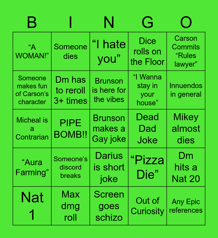 This bingo card has a free space and 35 words: Someone shows off their dice, “His bone got boned”, Pizza tax mentioned, Dm has to reroll 3+ times, Darius is short joke, Dice rolls on the Floor, Someone makes fun of Carson’s character, Cam falls asleep, Brunson is here for the vibes, Micheal attacks someone, Micheal is a Contrarian, Carson Commits “Rules lawyer”, Cam says “Oh My God”, Bryan doesn’t pay attention, “A WOMAN!”, Dead Dad Joke, Out of Curiosity, PIPE BOMB!!, “Aura Farming”, Any Epic references, “Pizza Die”, Nat 1, Dm hits a Nat 20, Max dmg roll, “I hate you”, Innuendos in general, Trauma dumping, The new npc is a woman, “I Wanna stay in your house”, Mikey almost dies, “CLANG!!”, Screen goes schizo, Someone’s discord breaks, Someone dies and Womp womp.