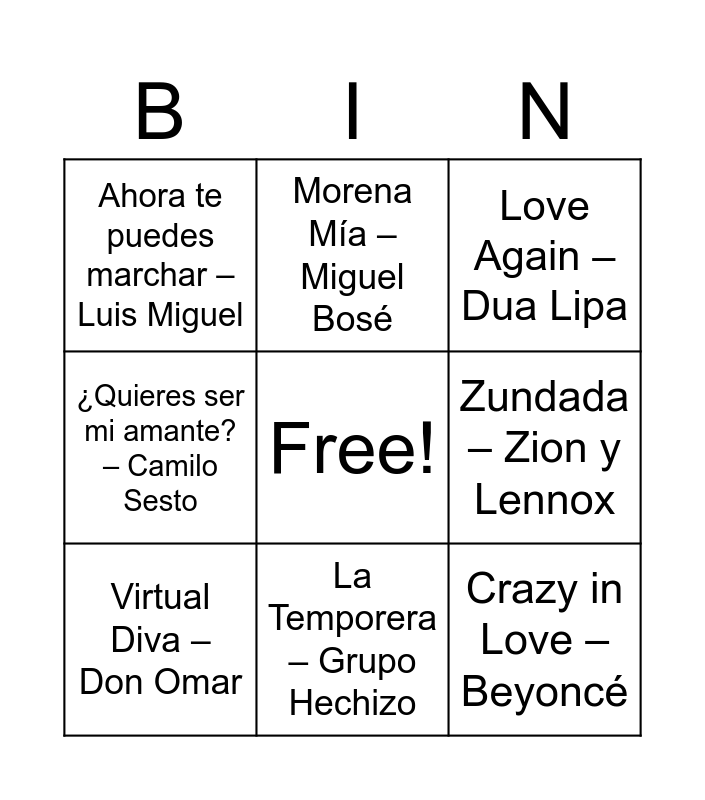 This bingo card has a free space and 8 words: Zundada – Zion y Lennox, Love Again – Dua Lipa, Morena Mía – Miguel Bosé, Virtual Diva – Don Omar, Ahora te puedes marchar – Luis Miguel, Crazy in Love – Beyoncé, ¿Quieres ser mi amante? – Camilo Sesto and La Temporera – Grupo Hechizo.