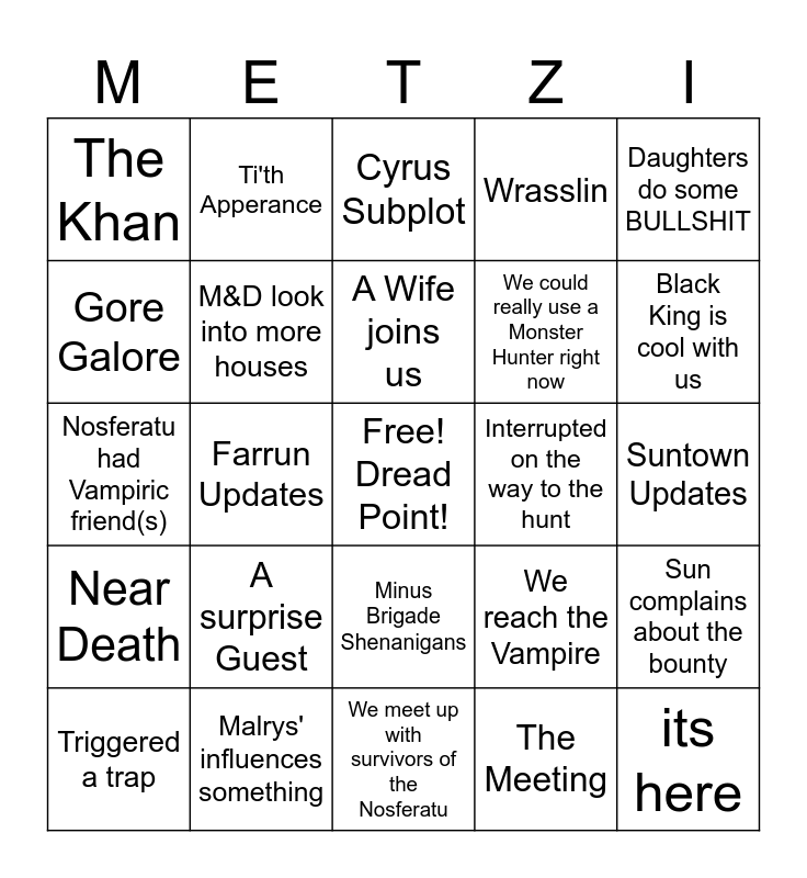 This bingo card has a free space and 27 words: We reach the Vampire, We defeat the Vampire, We could really use a Monster Hunter right now, We meet up with survivors of the Nosferatu, Gore Galore, Cyrus Subplot, Ti'th Apperance, Near Death, Interrupted on the way to the hunt, Sun complains about the bounty, Nosferatu had Vampiric friend(s), Wrasslin, Triggered a trap, Malrys' influences something, Black King is cool with us, CURSED, M&D look into more houses, A Wife joins us, A surprise Guest, The Khan, Suntown Updates, The Meeting, Farrun Updates, its here, Minus Brigade Shenanigans, Daughters do some BULLSHIT and Witches be Witchen.