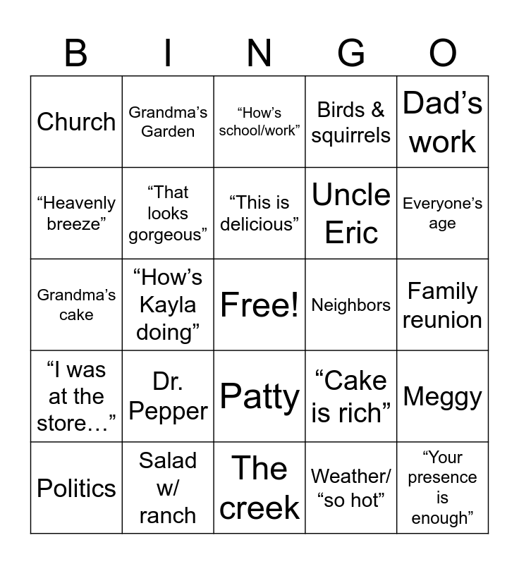 This bingo card has a free space and 24 words: Dr. Pepper, Salad w/ ranch, “This is delicious”, Politics, Dad’s work, Church, “Heavenly breeze”, Grandma’s Garden, Neighbors, Patty, Uncle Eric, Grandma’s cake, “Cake is rich”, Meggy, “That looks gorgeous”, Weather/ “so hot”, Family reunion, “How’s school/work”, Everyone’s age, “How’s Kayla doing”, “Your presence is enough”, “I was at the store…”, Birds & squirrels and The creek.