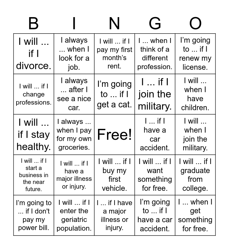 This bingo card has a free space and 35 words: I will ... when I marry., I always ... when I want to drive a car., I’m going to ... if I get my driver’s license., I always ... after I see a nice car., I will ... if I buy my first vehicle., I ... when I think of a different profession., I will ... if I change professions., I always ... when I see a cat., I’m going to ... if I get a cat., I ... if I’m healthy., I will ... if I stay healthy., I’m going to ... if I renew my license., I ... when I think of my own house., I will ... if I buy my first home., I will ... if I divorce., I ... if I have a car accident., I’m going to ... if I have a car accident., I always ... when I pay for my own groceries., I will ... if I start a business in the near future., I ... when I get something for free., I will ... if I want something for free., I’m going to ... if I don't pay my power bill., I will ... if I graduate from college., I will ... if I enter the geriatric population., I will ... if I pay my first month’s rent., I will ... when I have children., I always ... when I have a dog., I will ... if I have a dog., I ... if I join the military., I will ... when I join the military., I’m going to ... if I receive a community award., I ... if I have a major illness or injury., I will ... if I have a major illness or injury., I always ... when I look for a job. and I will ... if I get a full-time job..