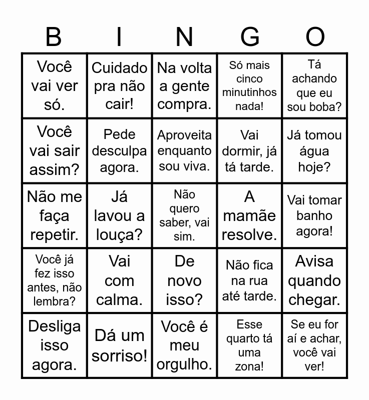 This bingo card has 75 words: Você não é todo mundo!, Leva um casaco, vai que esfria., Na volta a gente compra., Eu avisei., Enquanto estiver debaixo do meu teto..., Já arrumou essa cama?, Coloca uma meia!, Come tudo, tem gente passando fome., Vai levar blusa sim., Eu não sou sua empregada., Se eu for aí e achar, você vai ver!, Tá pensando que dinheiro dá em árvore?, Aproveita enquanto sou viva., Você vai sair assim?, Quando você for mãe, vai entender., Já lavou a louça?, Se correr é pior!, Não quero saber, vai sim., Porque sim, e ponto., Tá achando que eu sou boba?, Eu conto até três!, Não me faça repetir., Pede desculpa agora., Cuidado pra não cair!, Só mais cinco minutinhos nada!, Me respeita que eu sou sua mãe., Cuidado com quem você anda., Fecha a boca quando mastiga., Vai estudar!, Só descansa quando terminar., Você acha que eu sou idiota?, Limpa esse quarto!, Quem você pensa que é?, Não fica na rua até tarde., Já tomou água hoje?, Vai dormir, já tá tarde., Você tá muito tempo nesse celular., Sai da frente da TV, Vai tomar banho agora!, Esse quarto tá uma zona!, Vem comer antes que esfrie., Não mexe nisso!, Vai dar um jeito nisso agora!, Põe o chinelo!, Não encosta nisso!, Eu tô falando com as paredes?, Desliga isso agora., Você vai ver só., Quando chegar em casa, a gente conversa., Põe a mesa pro jantar., Vai ajudar seu irmão., De novo isso?, Eu te avisei mil vezes!, Você não me escuta nunca?, Vai logo!, Eu só quero o seu bem., Confia na sua mãe., Tá com fome?, Não esquece o guarda-chuva., Leva uma fruta., Vai com calma., Eu só falo porque me importo., Vai passar frio., Eu te amo, viu?, Quer um cafezinho?, A mamãe resolve., Vem aqui me dar um beijo., Vai devagar., Cuidado com a cabeça!, Avisa quando chegar., Você já fez isso antes, não lembra?, Dá um sorriso!, Eu sei que você consegue., Você é meu orgulho. and Tá com dor? Quer que eu olhe?.