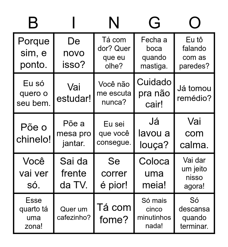 This bingo card has 75 words: Já arrumou essa cama?, Você vai sair assim?, Tá com dor? Quer que eu olhe?, Vai logo!, Aproveita enquanto sou viva., Dorme com Deus., Desliga isso agora., Vai dar tudo certo., Sai da frente da TV., Quando você for mãe, vai entender., Só descansa quando terminar., Se eu for aí e achar, você vai ver!, Você não me escuta nunca?, Eu só quero o seu bem., Vai ajudar seu irmão., Põe a mesa pro jantar., Pede desculpa agora., Eu sei que você consegue., Você não é todo mundo!, Eu tô falando com as paredes?, Tá achando que eu sou boba?, Põe o chinelo!, Vai estudar!, De novo isso?, Fecha a boca quando mastiga., Vai devagar., Eu te amo, viu?, Já tomou água hoje?, Tá com fome?, Vai dormir, já tá tarde., Me respeita que eu sou sua mãe., Quem você pensa que é?, Você é meu orgulho., Coloca uma meia!, Já tomou remédio?, Cuidado pra não cair!, Cuidado com a cabeça!, Você parece cansado., Vai com calma., Só mais cinco minutinhos nada!, Você acha que eu sou idiota?, Eu avisei., Eu só falo porque me importo., Não mexe nisso!, Leva um casaco, vai que esfria., Quando chegar em casa, a gente conversa., Esse quarto tá uma zona!, Porque sim, e ponto., Tá pensando que dinheiro dá em árvore?, Confia na sua mãe., Avisa quando chegar., Se correr é pior!, Você já fez isso antes, não lembra?, Vai levar blusa sim., Não quero saber, vai sim., Vai tomar banho agora!, Eu conto até três!, Vai passar frio., Não esquece o guarda-chuva., Não me faça repetir., Sai da frente da TV., Eu te avisei mil vezes!, Na volta a gente compra., Come tudo, tem gente passando fome., Não encosta nisso!, Já lavou a louça?, A mamãe resolve., Tô com saudade de você., Limpa esse quarto!, Vai dar um jeito nisso agora!, Você vai ver só., Quer um cafezinho?, Vai com calma., Tá com fome? and Leva uma fruta..