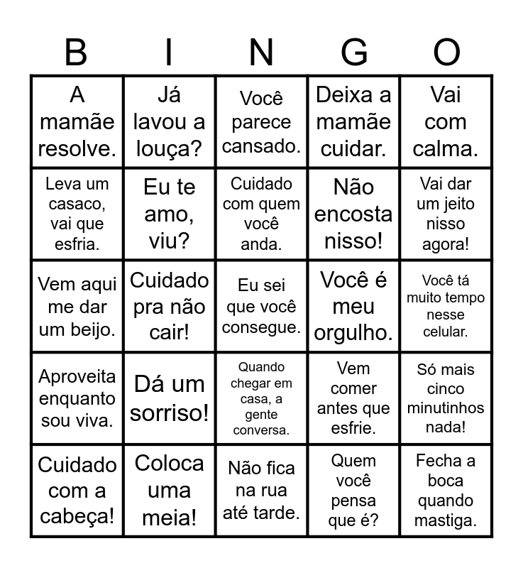 This bingo card has 75 words: Põe o chinelo!, Eu não sou sua empregada., Você parece cansado., Tá com dor? Quer que eu olhe?, Vai passar frio., Come tudo, tem gente passando fome., Pede desculpa agora., Põe a mesa pro jantar., Na volta a gente compra., Avisa quando chegar., Fecha a boca quando mastiga., Já tomou remédio?, Cuidado com quem você anda., Leva um casaco, vai que esfria., Só descansa quando terminar., Cuidado pra não cair!, Se eu for aí e achar, você vai ver!, Eu sei que você consegue., Desliga isso agora., Vai com calma., Vai devagar., Vem aqui me dar um beijo., Eu te amo, viu?, Já lavou a louça?, Deixa a mamãe cuidar., Vai tomar banho agora!, Você não me escuta nunca?, Você já fez isso antes, não lembra?, Não mexe nisso!, Vai ajudar seu irmão., Tá achando que eu sou boba?, Quando você for mãe, vai entender., Já arrumou essa cama?, Vem comer antes que esfrie., Vai dar um jeito nisso agora!, Não encosta nisso!, Quer um cafezinho?, Leva uma fruta., Você tá muito tempo nesse celular., Quem você pensa que é?, Vai dormir, já tá tarde., Tá pensando que dinheiro dá em árvore?, Porque sim, e ponto., Eu conto até três!, Já tomou água hoje?, Não esquece o guarda-chuva., Cuidado com a cabeça!, A mamãe resolve., Você vai sair assim?, Eu só falo porque me importo., Você vai ver só., Quando chegar em casa, a gente conversa., Não me faça repetir., Você não é todo mundo!, Confia na sua mãe., Eu tô falando com as paredes?, De novo isso?, Sai da frente da TV., Esse quarto tá uma zona!, Eu te avisei mil vezes!, Dá um sorriso!, Não quero saber, vai sim., Eu só quero o seu bem., Você acha que eu sou idiota?, Enquanto estiver debaixo do meu teto..., Você é meu orgulho., Tá com fome?, Vai logo!, Vai levar blusa sim., Só mais cinco minutinhos nada!, Aproveita enquanto sou viva., Coloca uma meia!, Vai estudar!, Não fica na rua até tarde. and Se correr é pior!.