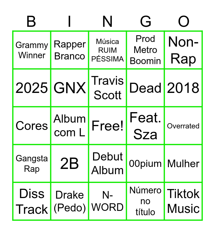 This bingo card has a free space and 24 words: 2B, Drake (Pedo), Travis Scott, Diss Track, Non-Rap, Grammy Winner, 2025, Rapper Branco, Feat. Sza, Debut Album, Dead, Cores, 00pium, Mulher, GNX, Número no título, Overrated, Música RUIM PÉSSIMA, 2018, Album com L, Tiktok Music, Gangsta Rap, Prod Metro Boomin and N-WORD.