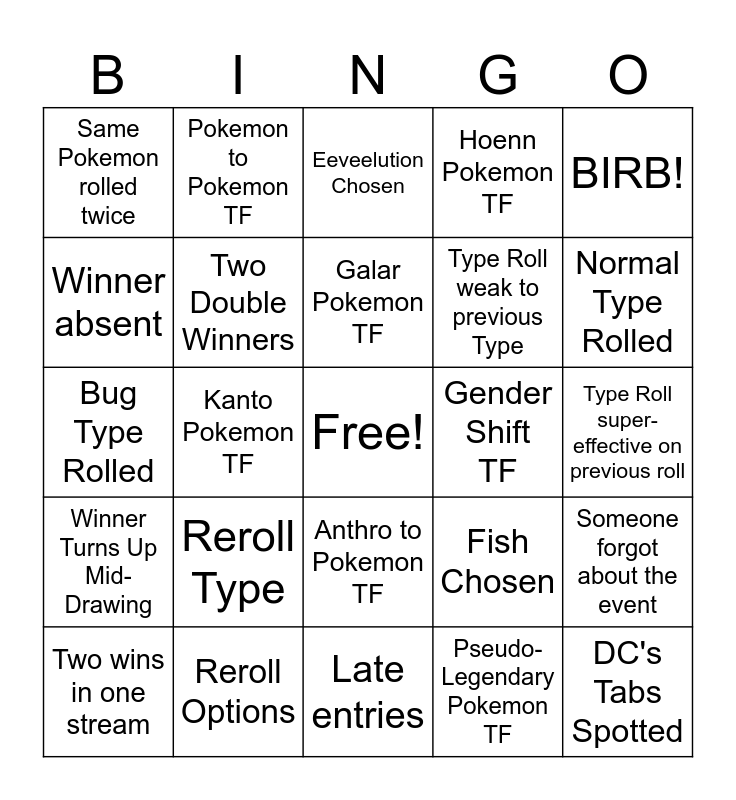 This bingo card has a free space and 24 words: Reroll Type, Reroll Options, Galar Pokemon TF, Two wins in one stream, BIRB!, Same Pokemon rolled twice, Winner absent, Pokemon to Pokemon TF, Gender Shift TF, Anthro to Pokemon TF, Type Roll weak to previous Type, Bug Type Rolled, Fish Chosen, Someone forgot about the event, Two Double Winners, Pseudo-Legendary Pokemon TF, Type Roll super-effective on previous roll, Eeveelution Chosen, Normal Type Rolled, Kanto Pokemon TF, DC's Tabs Spotted, Winner Turns Up Mid-Drawing, Hoenn Pokemon TF and Late entries.