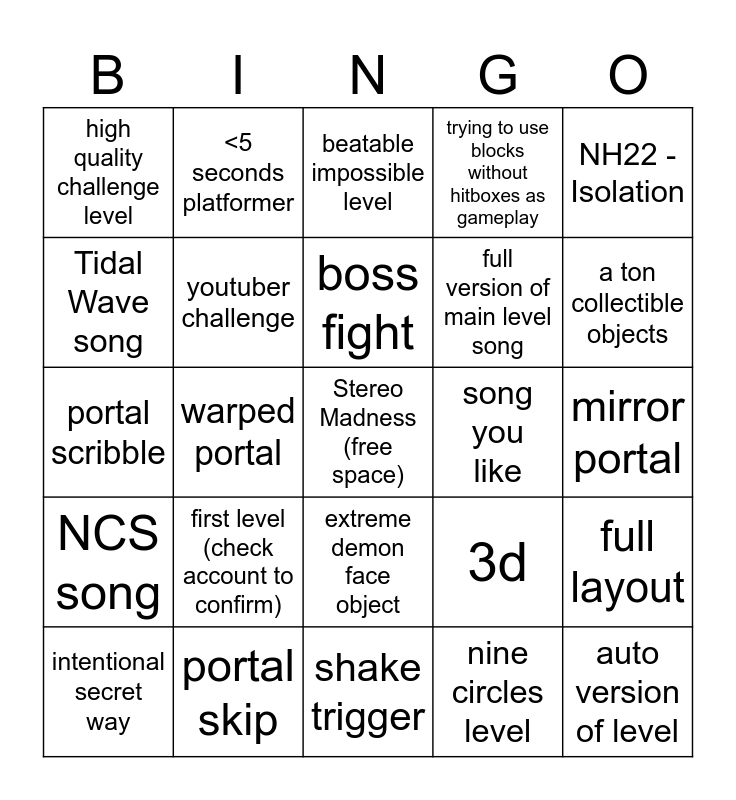 This bingo card has a free space and 99 words: lobotomy level, good gameplay, actually impossible level, beatable impossible level, unnamed level with a really high number, keyboard mash title, unedited copy of rated level, edited copy of rated level, only 1.0 objects, XL level (not copied), world's hardest ___, empty level, level preview, extreme demon face object, superbuffed Robtop level, high quality challenge level, <5 seconds platformer, straight fly, SFX abuse, "fire in the hole" pitched up or down, actual hard platformer, make your ___, really slow timewarp trigger spam challenge, good deco (not copied), layout with a tiny amount of deco before they gave up, full layout, boss fight, normal face object, cursed thorn monster, bad camera controls, shake trigger, nine circles level, interesting dual gameplay, 2 player, warped portal, portal scribble, orb scribble, chaotic object spam, an attempt at good deco, first level (check account to confirm), a ton of animated objects, a ton collectible objects, trying to use blocks without hitboxes as gameplay, portal skip, orb skip, awful transition, entirely slow speed, entirely 4x speed, awkward slope gameplay, a lot of text, story level, auto version of level, 3d, bug showcase, hitbox showcase, clubstep monster, at least 4 triple spikes, quad spike, actually hard spam challenge, click consistency challenge, atrocious colors, level with only 1 to 3 objects, multiple songs, hexagon force, Creo song, NH22 - Isolation, At the Speed of Light, Waterflame custom song, Kevin MacLeod song, NCS song, Rukkus Song (not a Nine Circles level), full version of main level song, Tidal Wave song, Robtop (aka Zhenmuron) song, Song from gauntlet level, Song from top 10 list demon, youtuber challenge, challenge for someone you don't know, level download failed, disliked level (by someone other than you), song you like, song you don't like, amazing username, level makes you confused, sightread a relatively hard level, troll level, same name as famous level but completely unrelated, arrow trigger, mirror portal, intentional secret way, fake secret way, blocks with no hitboxes, breakable blocks, free coins, hard coins (must collect), super epic swag route, song that you haven't heard in a long time, pixel background and no s block dash orb.
