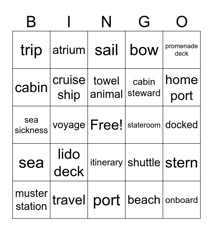 This bingo card has a free space and 30 words: travel, excursion, voyage, vacation, trip, sail, cruise ship, itinerary, stateroom, port, docked, onboard, beach, aboard, home port, port of call, shuttle, sea, lido deck, promenade deck, sea sickness, captain, atrium, cabin steward, cabin, bow, stern, muster station, towel animal and ocean.