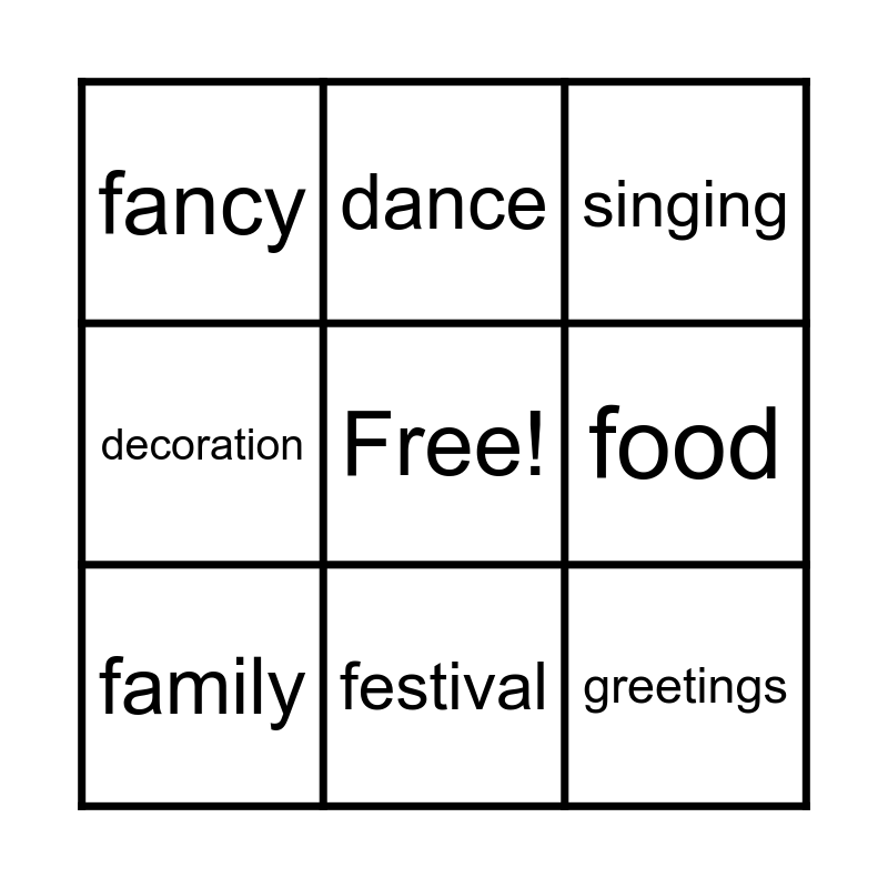 This bingo card has a free space and 11 words: celebrations, festival, greetings, family, dance, singing, food, gifts, decoration, fancy and clothes.